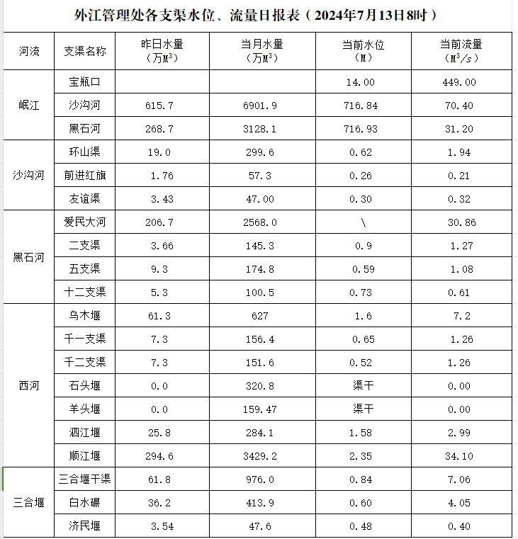 外江管理处各支渠水位、流量日报表(2024年7月13日8时)