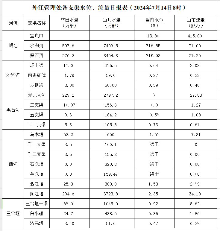 外江管理处各支渠水位、流量日报表(2024年7月14日8时)