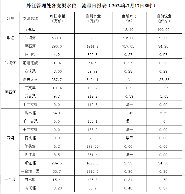 外江管理处各支渠水位、流量日报表(2024年7月17日8时)