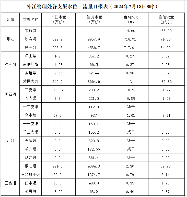 外江管理处各支渠水位、流量日报表(2024年7月18日8时)