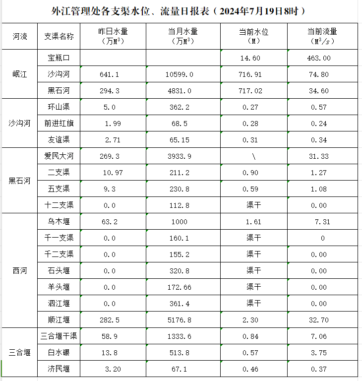 外江管理处各支渠水位、流量日报表(2024年7月19日8时)