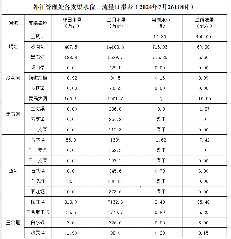 外江管理处各支渠水位、流量日报表(2024年7月26日8时)