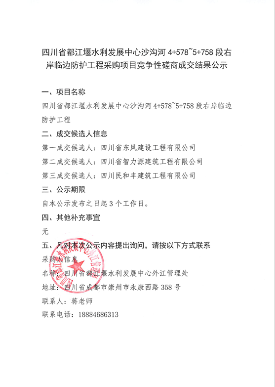 四川省都江堰水利发展中心外江管理处沙沟河4+578~5+758 段右岸临边防护工程成交结果公示