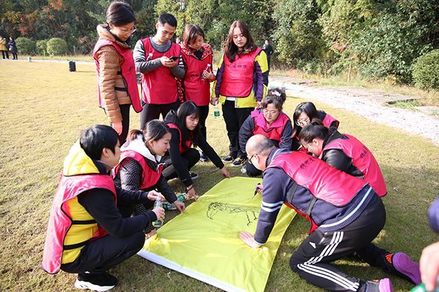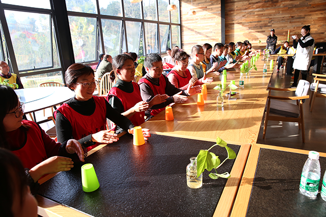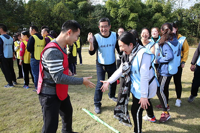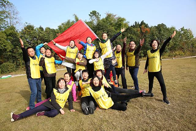 活动开始,教练首先将全体人员分成三个团队,并要求每个团队选举队长、设计队名、口号、队歌、队旗等,建立自己的团队文化。经过每个团队的精心谋划,一个个特色鲜明的队名、富有特点的LOGO,一首首嘹亮的队歌,一个个响亮的团队口号和充满激情的团队造型逐一精彩亮相,拓展训练正式拉开序幕。为更好地帮助大家舒展筋骨、迅速转变角色,在教练的带领下,开展了跑步热身、“教练说”等破冰热身小游戏,大家整装待发,跃跃欲试。随后,3个团队的队员先后进行了“争分夺秒”、“杯子舞”等拓展项目,各队队员齐心协力、相互加油、相互鼓励,以满腔热情和执着追求完成了一项又一项任务。特别是在“杯子舞”环节中,通过团队强化训练,队员们从对动作的生疏到熟练,从对技巧的无知到掌握,从对节奏的陌生到把握,队员之间的配合越来越默契,动作逐渐变得协调一致、整齐划一,最终演绎出了令人震撼的场面,顺利完成了挑战,大家共同分享到了成功的喜悦和挑战的激情。