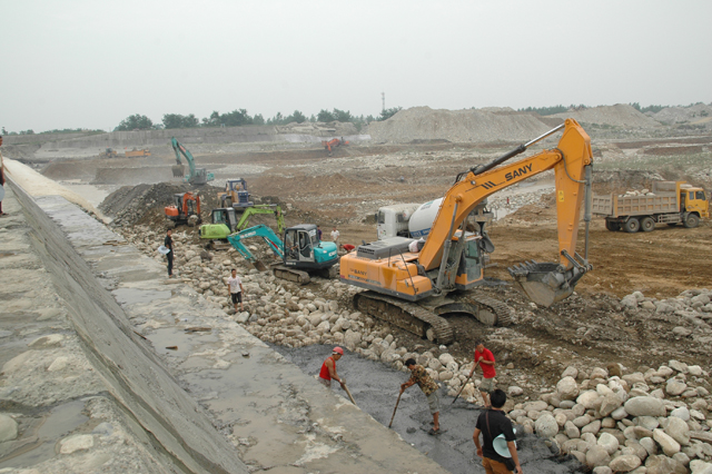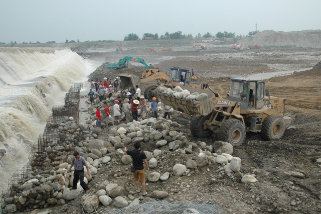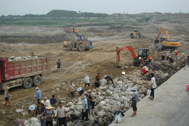 挖掘机12台、装载机6台、推土机1台、各类汽车20余台、发电机2台、民工100余人,24小时不停工作业,截止7月16日,通过回填并装钢筋笼浇筑砼护面、砼六面体护脚防冲等措施的完工,抢险工作告一段落。