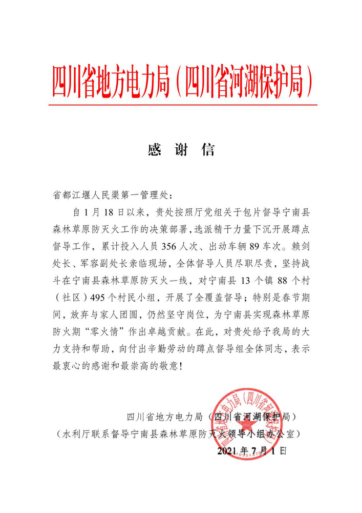 近日,人民渠一处收到水利厅联系督导宁南县森林草原防灭火领导小组办公室发来的感谢信,对于我处在宁南县森林草原防火督导工作给予高度肯定和表扬,诚挚地感谢我处的支持和督导小组成员的辛勤付出。