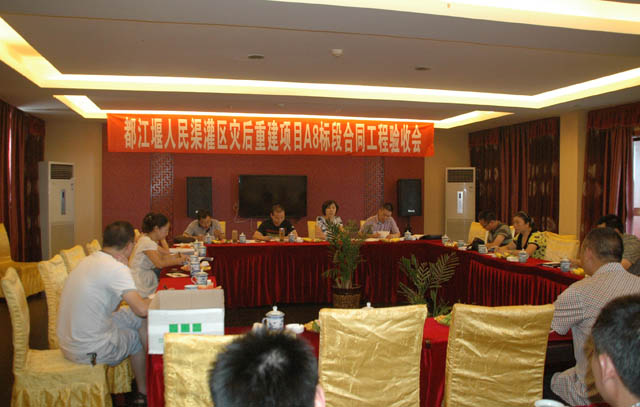 2012年8月3日,四川省都江堰人民渠第一管理处在什邡市主持召开了都江堰灌区人民渠干渠灾后重建项目A8标段合同(单位)工程验收会议。会议由人民渠一处总工李国贤同志主持。参加验收会议的有项目业主四川省都江堰人民渠第一管理处,监理单位四川省都江堰管理局水利水电工程建设监理部,设计单位都江堰勘测设计院,施工单位四川省仁寿黑龙滩工程总公司,运行管理单位人民渠一处什邡管理站等单位的领导和技术人员。质量与安全监督单位四川省水利基本建设质量监督中心站的代表列席会议。