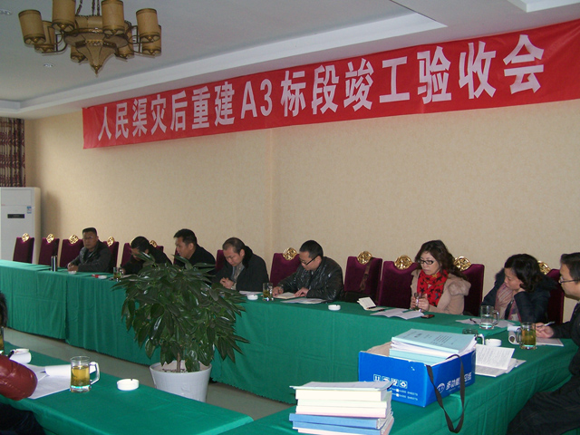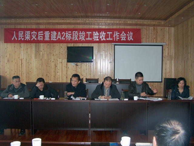 2012年12月26日,四川省都江堰人民渠第一管理处在绵竹市主持召开了都江堰灌区人民渠重建项目A2、A3标段合同工程完工验收会议。会议由人民渠一处总工程师李国贤主持。参加验收会议的有项目业主四川省都江堰人民渠第一管理处,监理单位四川永一建设工程项目管理有限公司,设计单位都江堰勘测设计院,施工单位湖南华宇水利水电建设工程有限公司、四川省川能水利水电建设有限公司,运行管理单位人民渠一处永兴管理站、孝泉管理站等单位的相关领导和技术人员。
