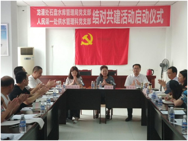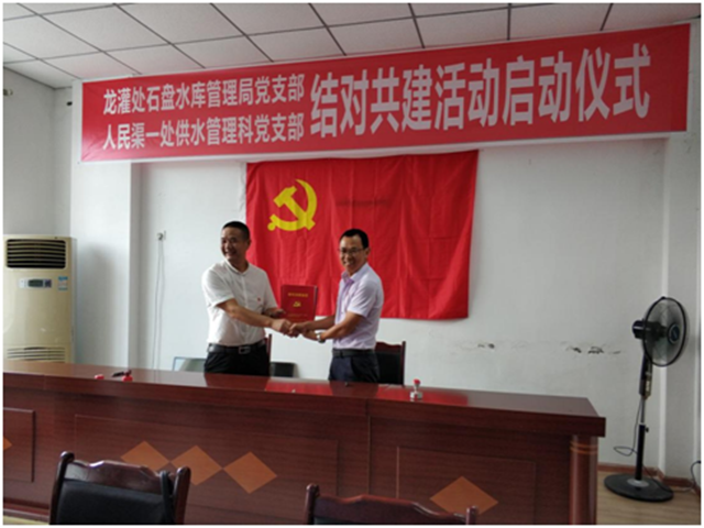 为深入贯彻落实中央和省委、厅党组关于加强基层党组织建设的决策部署,着力构建都江堰灌区水管单位基层党组织互帮互助常态化、长效化机制,共同提高灌区基层党建工作新格局,推动灌区基层党建全面进步、全面过硬。2018年8月10日下午,人民渠一处供水管理科党支部与龙泉山灌区石盘水库管理局党支部结对共建活动启动仪式在石盘水库管理局举行。会议由龙灌处党办主任向海鹰主持,人民渠一处副处长贾军容,龙灌处党委副书记张德书参加了启动仪式。