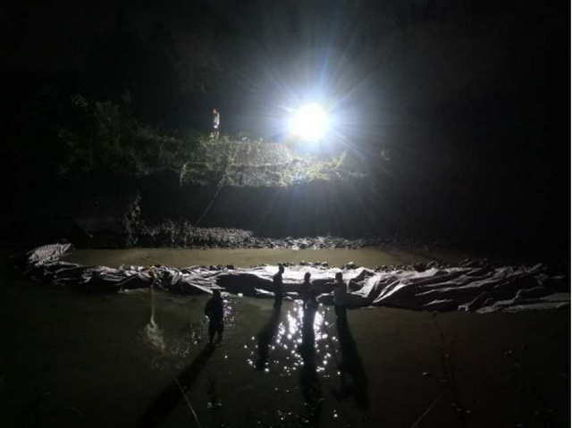 8月13日蒙阳河养护段周家桥下深夜施工抢险现场