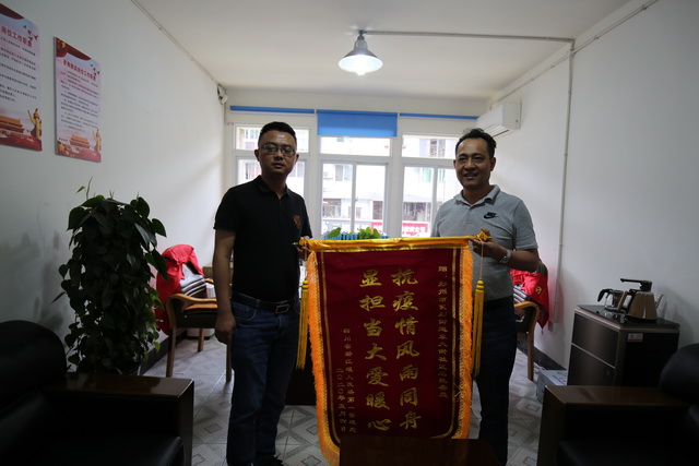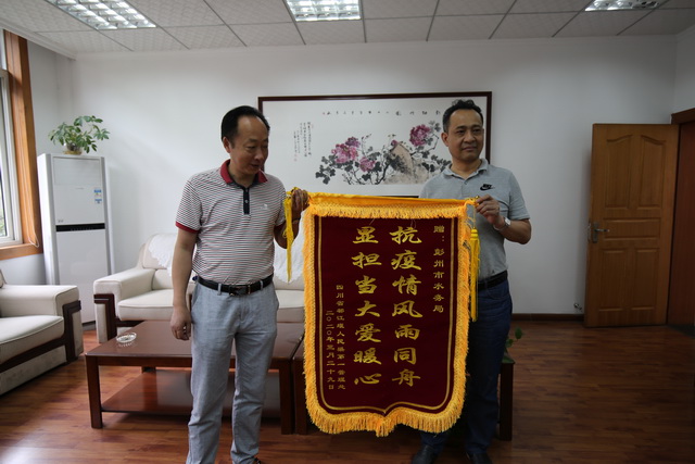 2020年5月9日,人民渠一处党委书记汤传波率处办公室、党委办公室和处团委负责同志,向在抗击新型冠状病毒感染的肺炎疫情中对人民渠一处给予关怀帮助的彭州市水务局、天彭镇东大街社区赠送锦旗,表达感谢。
