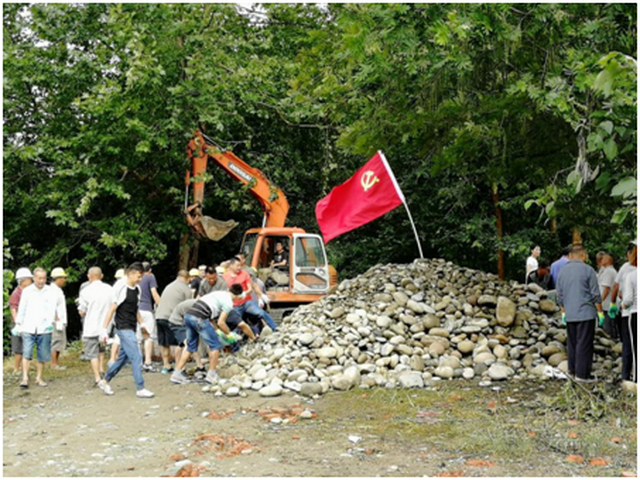 一场与洪水搏击的战斗悄然打响。红旗在烈日下招展飘扬,抢险队员们分工协作、齐心协力、争相上前,争分夺秒抢进度。吴书记带头行动,与抢险人员一起分发编织袋、搬运砂砾、装填沙袋。