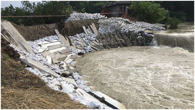 7月8日-12日连续强降雨致使青白江大河水位陡涨,青白江长寿桥最大洪峰流量达966立方米/秒,洪水造成人民渠一处所辖青白江麻水河拦河坝右坝段近20余米悬空,拦河坝下游右岸堤防垮塌50余米。