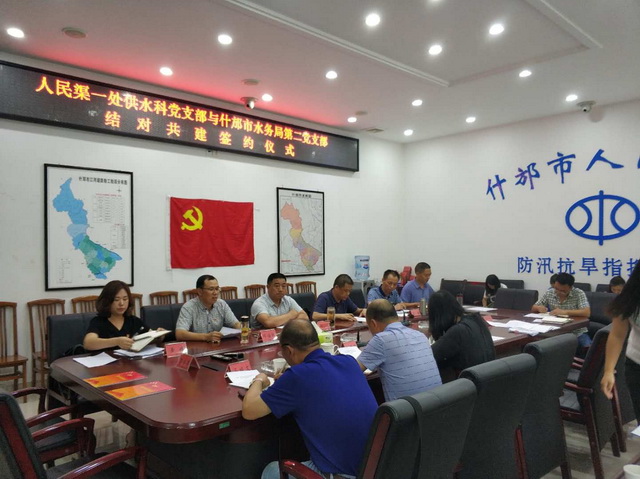 2018年7月10日下午,人民渠一处供水科党支部与什邡市水务局第二党支部结对共建签约仪式在什邡市水务局举行。会议由什邡市水务局第二党支部书记黄婷主持,人民渠一处处长赖剑、什邡市水务局党委书记、局长尚海参加了签约仪式。