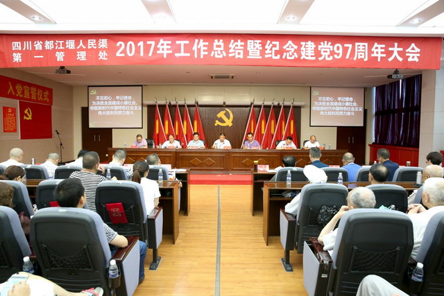 大会在庄严的国歌声中拉开帷幕。会议通报了2017年度绩效管理考核结果和水利厅2017年度都江堰灌区“十个坚持”先进单位,对2017年生产工作中涌现出的9个先进集体、30名先进生产工作者和2017年-2018年“创先争优”活动中涌现出的4个先进党组织、5名优秀党务工作者及16名优秀共产党员进行了表彰,并对上年度党费收支和党组织党建活动费使用情况进行了通报。新党员在党委书记汤传波领誓下进行入党宣誓。