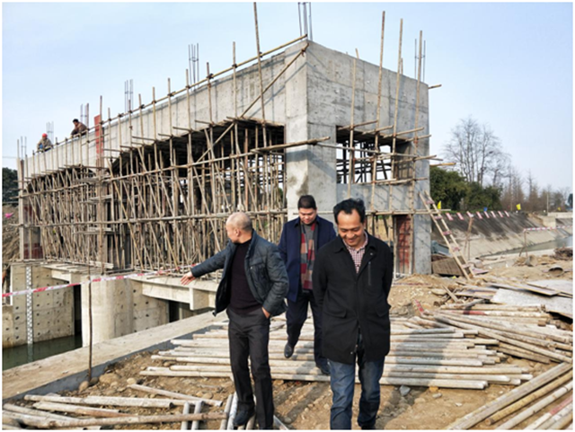 在人民渠干渠四期工程建设工地施工现场,汤传波、李国贤听取了孝泉站、施工单位负责人对工程建设进展情况的汇报,对跨渠交通桥、干渠节制闸施工进行了现场指导,并提出以下要求,一是加大水面工程施工组织力度,加快施工进度。二是规范施工操作,确保施工安全。三是做好工地春节放假期间的防火、防盗管理和安全防护工作。