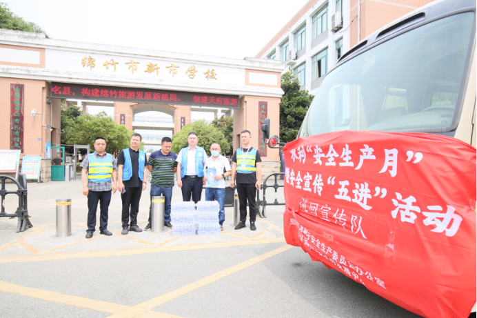 2022年6月16日中午,一辆车身、车头分别张贴“遵守安全生产法,当好第一责任人”“水利‘安全生产月’ 暨安全宣传‘五进’活动巡回宣传队”主题横幅和海报的宣传车行进在前往绵竹市新市学校途中,吸引市民驻足观看。这是按照国务院安委办、省安办和省水利厅有关安全宣传“五进”工作的通知,深入基层开展安全宣传“进灌区、进工地、进社区、进企业”等要求,人民渠第一管理处为绵竹市新市学校送去安全生产有关宣传物资的场景。
