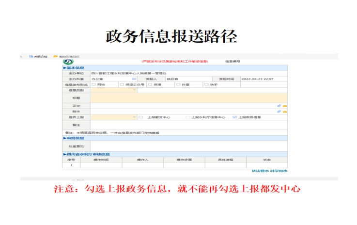 会议学习了《四川省水利厅办公室关于加强2022年水利厅系统政务信息工作的通知》《四川省都江堰水利发展中心关于进一步规范政务信息管理工作的通知》,传达了都发中心政务信息工作会议精神和任务要求,通报了全处上半年信息工作开展情况,对公文易错点进行讲解,推荐了公文写作参考书籍《<党政机关公文格式>国家标准应用指南》,安排部署下半年政务信息任务,提出选题参考方向。