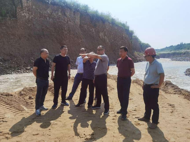周宗剑一行冒着高温酷暑,沿着临时抢险下河通道,来到石亭江人民渠涵洞下游消力池尾坎下端河心处,详细了解工程损毁情况,认真听取工程抢险方案和下一步抢险措施介绍。
