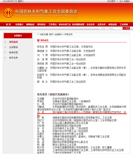 9月21日,在河南郑州召开的中国农林水利气象工会第五届一次全委会上,都发中心人民渠第一管理处冯政同志当选为常务委员。他是唯一一名当选常务委员的水利系统基层工作者。