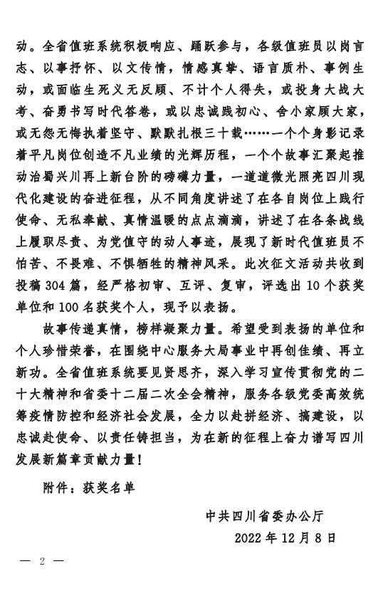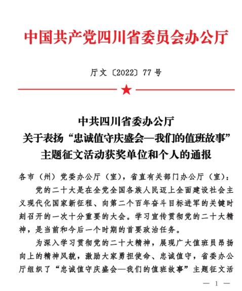 12月9日,中共四川省委办公厅印发的《中共四川省委办公厅关于表扬 “忠诚值守庆盛会—我们的值班故事”主题征文活动获奖单位和个人的通报》(厅文〔2022〕77号)中,人民渠第一管理处供水管理科赖兴艳同志参赛作品《共此青绿》经过激烈角逐,榜上有名。