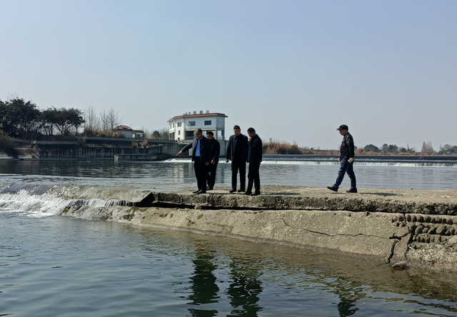 周宗剑一行查看了马棚堰引水枢纽工程,详细了解了消力池护坦齿墙沉陷水毁情况,听取李强关于工程应急加固措施方案以及下一步修复计划等方面介绍。