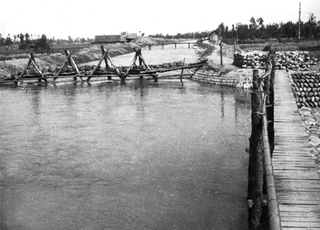 原官渠堰渠首杩槎围堰进水口(1953年)(左)、人民渠渠首(右)