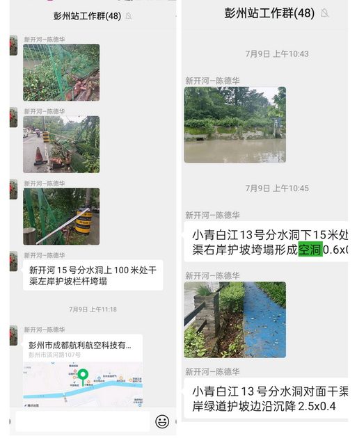 经巡查,发现小青白江13号分水洞下15米处干渠右岸护坡和新开河段王家磨上涵洞干渠右岸护坡出现空洞,新开河段王家磨上涵洞干渠左岸大树倾倒于渠道内,存在严重安全隐患,陈德华立即将情况上报管理站。