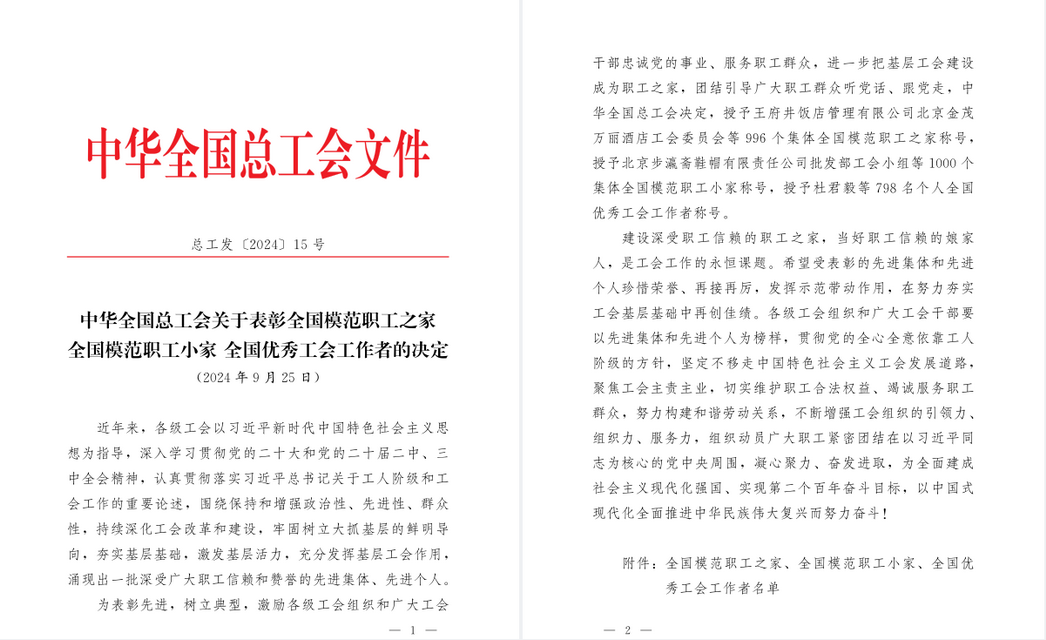 《关于表彰全国模范职工之家 全国模范职工小家 全国优秀工会工作者的决定》(总工发〔2024〕15号)