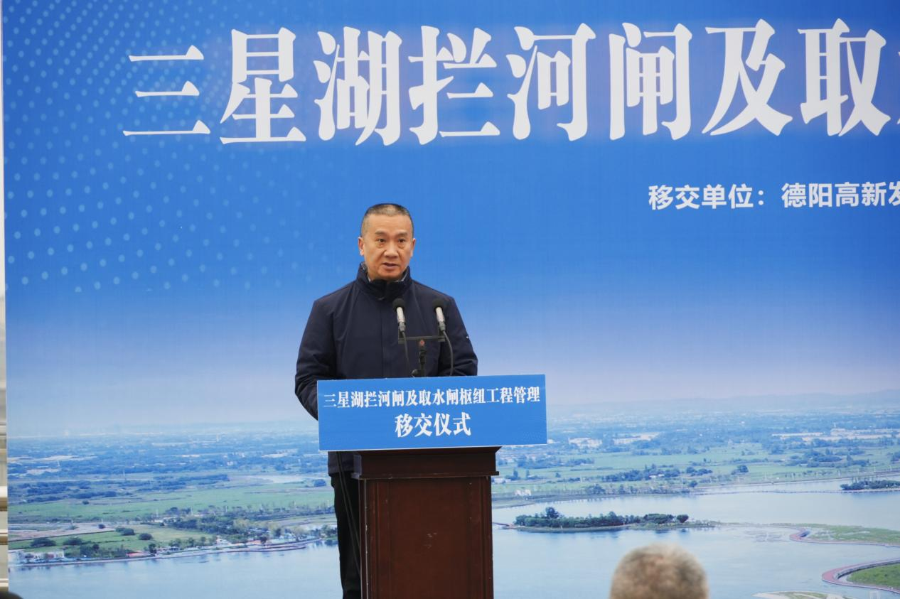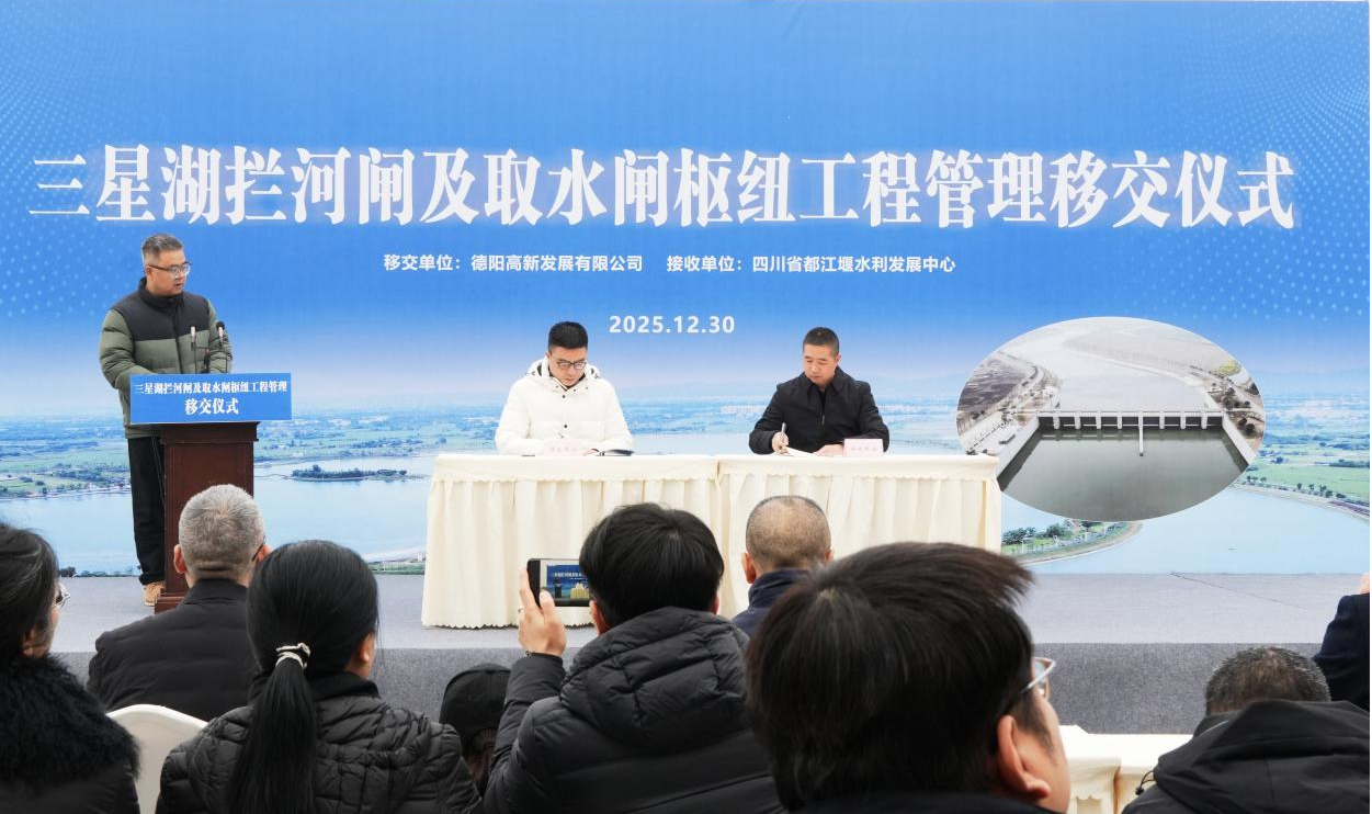 2025年12月30日上午,三星湖拦河闸即取水闸枢纽工程管理移交仪式在德阳高新区三星湖畔举行。四川省都江堰水利发展中心党委副书记李彦富、德阳高新技术产业开发区管理委员会副主任陈明,四川省都江堰水利发展中心人民渠第一管理处党委书记、处长周宗剑以及德阳高新区管委会、广汉市水利局、德阳高新发展有限公司、中铁城建集团公司、中铁23局相关负责人,人民渠第一管理处机关相关科(室)管理站负责人、职工代表参加仪式。仪式由德阳高新发展有限公司党委副书记、副总经理张意主持。