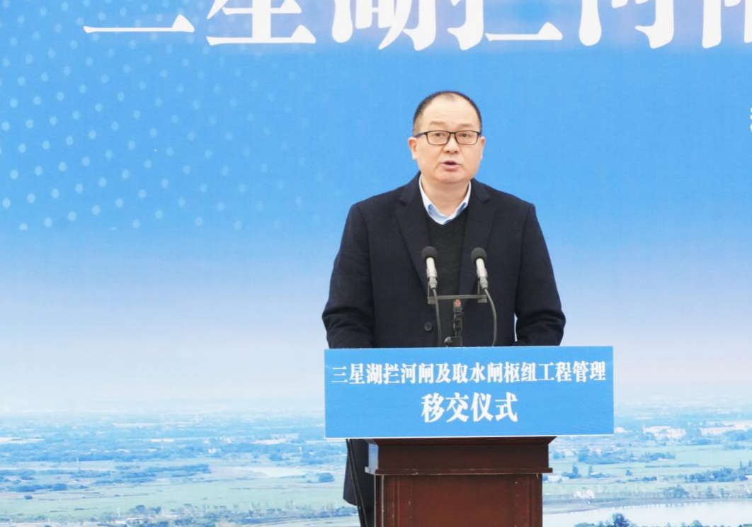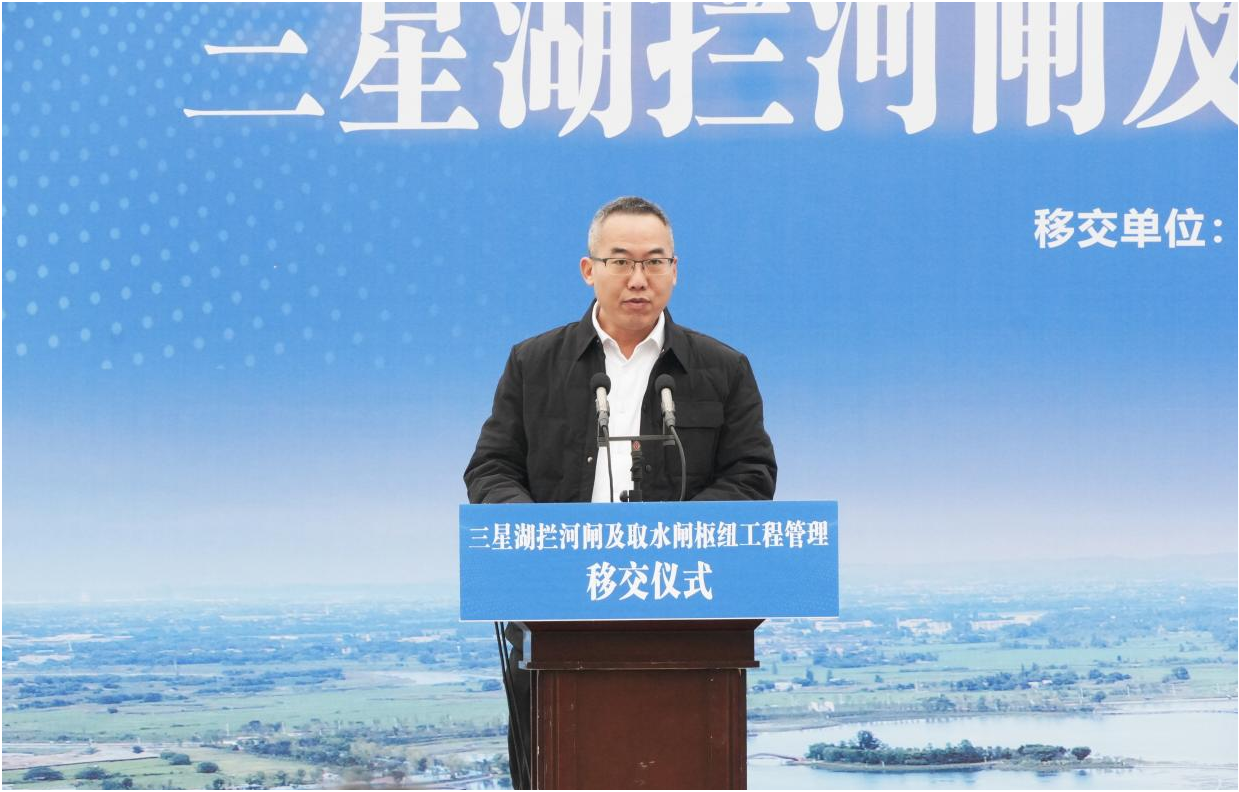 陈明在讲话中对工程管理的顺利移交表示祝贺。他指出,工程管理移交是工程发挥长期效益的新起点,三星湖水闸枢纽工程必将在人民渠第一管理处的专业维护下持续发挥综合效益,并希望各方继续关心支持工程运行,为工程管理创造良好外部环境。
