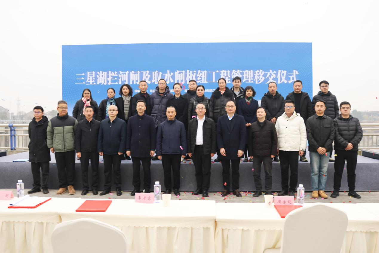仪式上,中铁城建集团公司水系项目指挥长吴昊代表施工单位汇报了代管理期间的工程维护情况,德阳高新发展有限公司副总经理熊伟洪代表建设单位介绍了工程建设情况。工程建设单位与运行管理单位签署了《三星湖拦河闸及取水闸枢纽工程移交协议》,并现场移交了工程钥匙及资料箱。