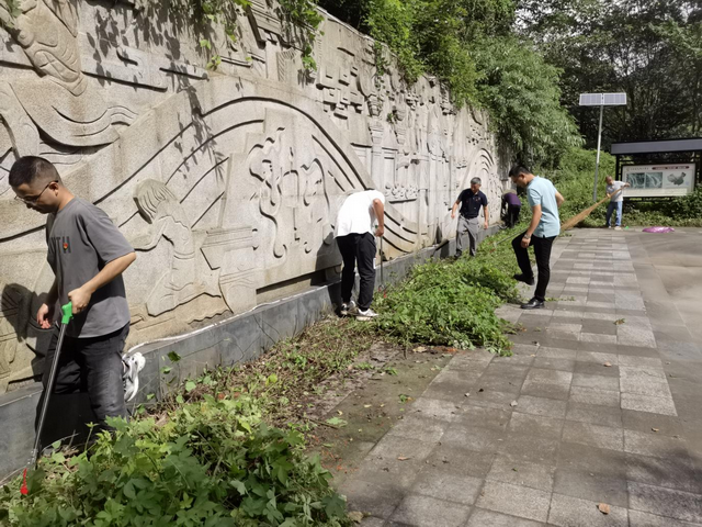 在活动中,党员同志们带着扫帚、火钳、铁铲、垃圾袋等工具,对遗址公园内的落叶、白色垃圾、果皮纸屑进行清理,对壁画周围的杂草树藤进行修剪,对展板、碑文进行擦拭。大家发扬不怕苦、不怕累、不怕脏的精神,相互配合、分工协作、各尽其责,忙得不亦乐乎,每个环节都一丝不苟,现场一片热火朝天的景象。