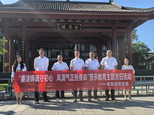 为深入贯彻中央八项规定精神,进一步增强党员干部廉洁自律意识、加强党员干部作风建设,6月30日,孝泉站党支部组织全体党员、预备党员、入党积极分子赴德阳市孝源里廉洁文化教育基地开展了“廉洁铸魂守初心 风清气正担使命”警示教育主题党日活动。