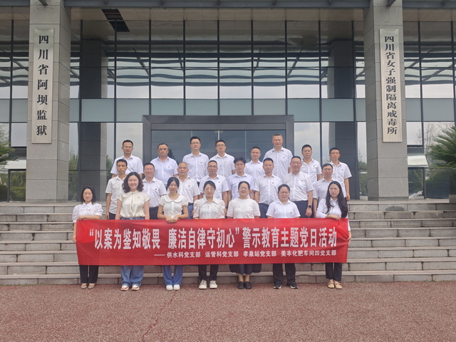 为进一步推进深入贯彻中央八项规定精神学习教育走深走实,强化党员干部廉洁自律意识,筑牢党员干部拒腐防变思想防线,深化警示教育。7月24日,孝泉站党支部联合运管科党支部、供水科党支部、美丰化肥分公司车间四党支部等各结对共建党支部共23名党员、入党积极分子赴四川省德阳监狱开展警示教育主题党日活动。通过跨支部协同联动,以沉浸式教育强化党员纪律意识,推动共建单位在党风廉政建设中凝聚合力、共筑防线。