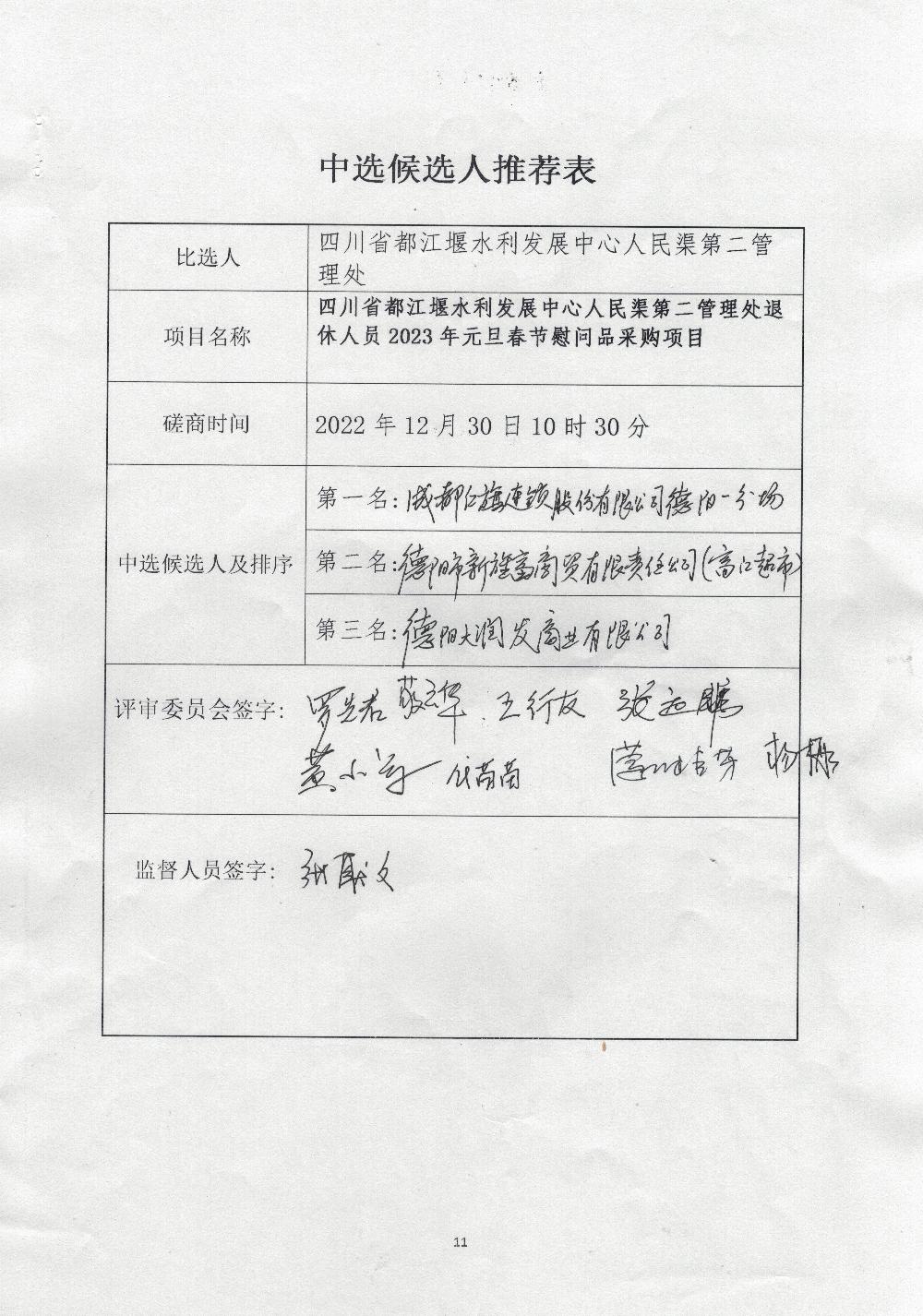 四川省都江堰水利发展中心人民渠第二管理处退休人员2023年元旦、春节慰问品采购项目,控制金额14.5万元(全处退休人员约290人,每人每份500元,付款时据实结算),通过竞争性磋商评选供货商。发出邀请公告后,德阳市新旌富商贸有限责任公司(即富江超市)、德阳大润发商业有限公司、成都红旗连锁股份有限公司德阳一分场等三家超市在邀请公告规定的时间内递交了响应文件,于2022年12月30日10:30(北京时间)在处机关三楼会议室进行了竞争性磋商。经商家现场二次报价,陈述各自优势,由纪检监督二室二办监督,离退科、办公室、财资科、退休人员代表共同评分,评分结果:成都红旗连锁股份有限公司德阳一分场得分最高,拟作为供货商候选人,现予以公示。