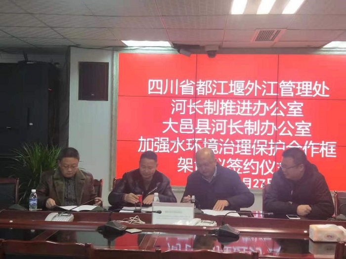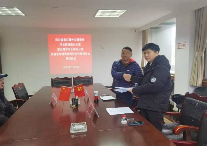 为深入贯彻落实中央和省市全面推行河长制决策部署,认真践行“绿水青山就是金山银山”理念,切实加强外江灌区水环境治理保护工作力度。根据《关于在都江堰灌区开展河长与灌区管理单位互访活动的通知》(川河长制办函﹝2020﹞49号)文件的工作安排,我处分别与灌区内各河长加强沟通交流。2020年11月27日-12月4日,外江管理处河长制推进办公室及相关管理站分别与都江堰市、崇州市、大邑县、邛崃市、新津区、温江区河长制办公室签署了《关于加强水环境治理保护合作的框架协议》,共同建立常态协调联动治水机制。相关河长制办公室负责同志参加了签约仪式。