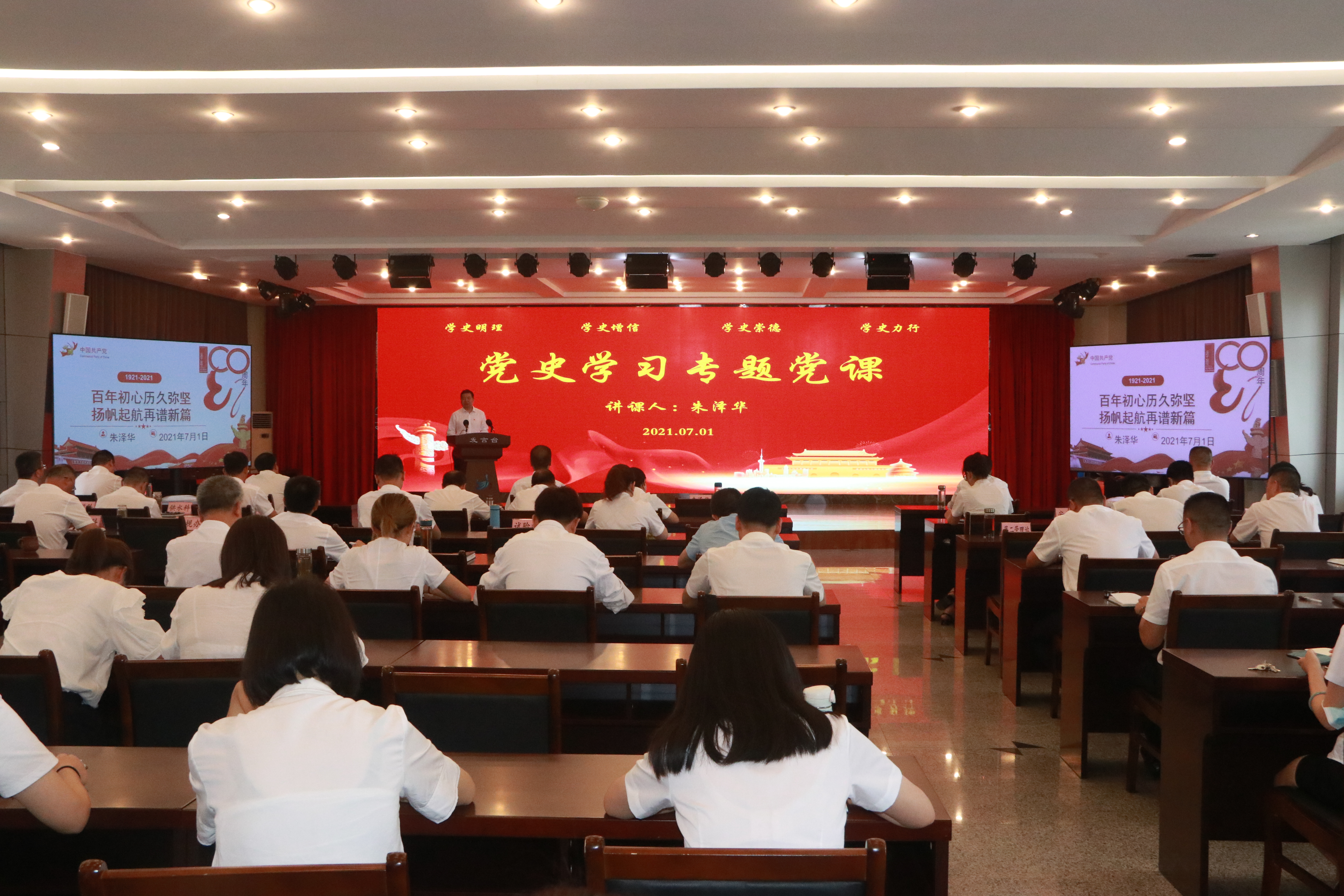 全体人员随大会高唱了中华人民共和国国歌,听取了中共中央总书记、国家主席、中央军委主席习近平的重要讲话。讲话全面回顾了中国共产党百年奋斗的光辉历程,展望了中华民族伟大复兴的光明前景,庄严宣告实现第一个百年奋斗目标,在中华大地上全面建成了小康社会,历史性地解决了绝对贫困问题,正在意气风发向着全面建成社会主义现代化强国的第二个百年奋斗目标迈进。党中央号召全体党员,牢记初心使命,坚定理想信念,践行党的宗旨,永远保持同人民群众的血肉联系,始终同人民想在一起、干在一起,风雨同舟、同甘共苦,继续为实现人民对美好生活的向往不懈努力,努力为党和人民争取更大光荣!
