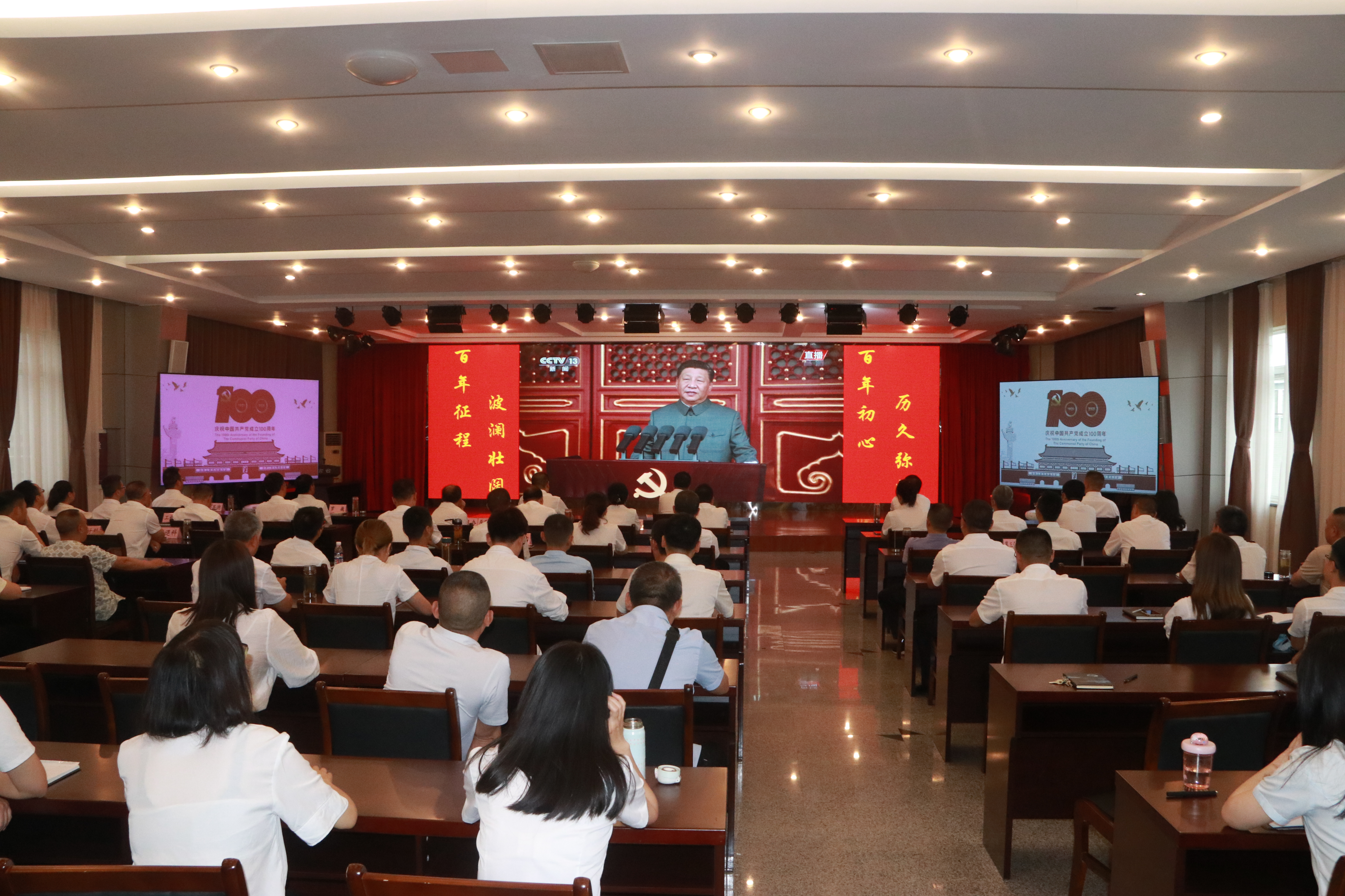 2021年7月1日上午,庆祝中国共产党成立100周年大会在北京天安门广场隆重举行。外江管理处组织全处机关党员干部职工100余人在六楼会议室集中观看了现场直播,处属各站、各处管单位组织党员干部职工在站部统一观看,离退休党员在家自行观看。