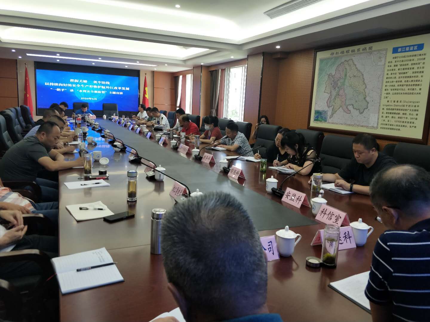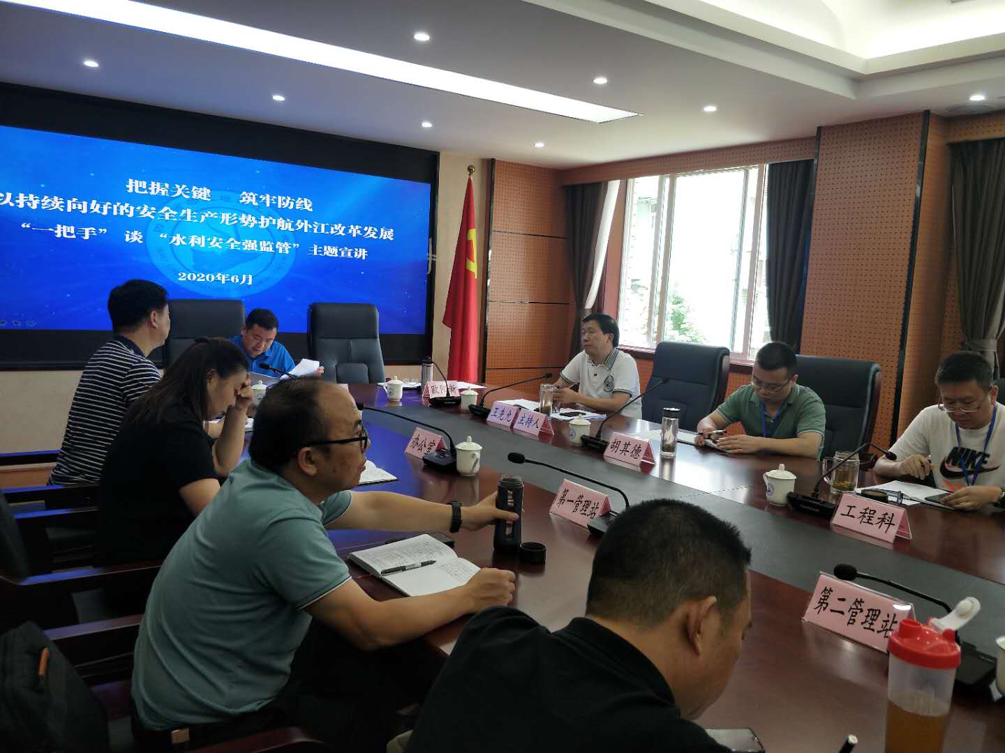6月为全国“安全生产月”,外江管理处积极贯彻落实水利厅活动要求,组织开展安全生产主题宣讲活动。6月29日下午13:30,我处组织召开“一把手”谈“水利安全强监管”主题宣讲会,在家处领导班子成员出席会议,处属各站、各处管单位、机关各科室负责人参加了此次会议。