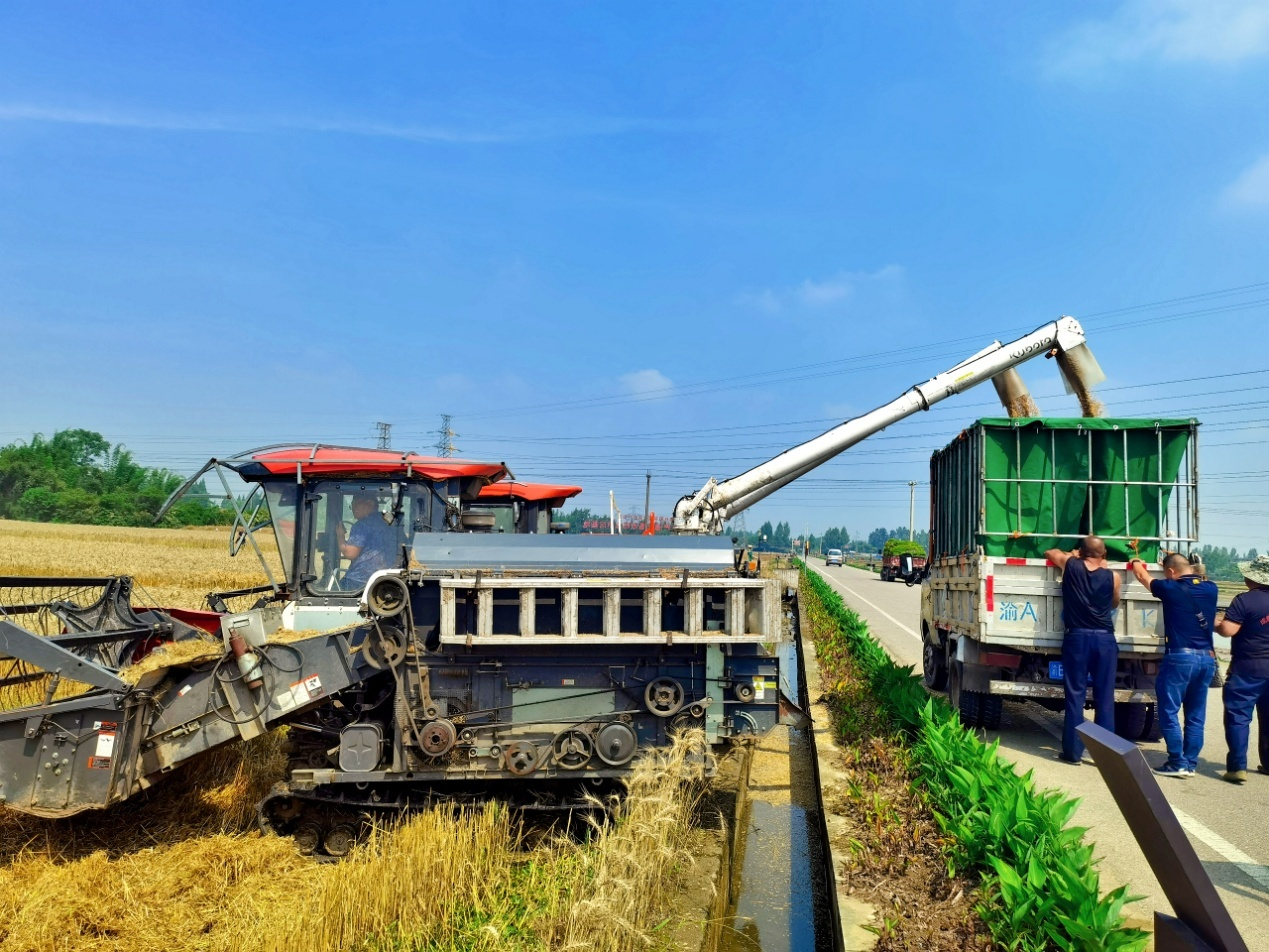 风吹麦浪穗飘香,小麦开镰收割忙。眼下,正值小麦丰收季节,位于外江灌区崇州市的成都市天府粮仓国家现代农业产业园11.1万亩小麦全面开镰收割,一台台收割机在金色的麦田里来回穿梭,驶过后留下一排排整齐的麦茬,田间地头呈现出一片热闹的丰收景象。