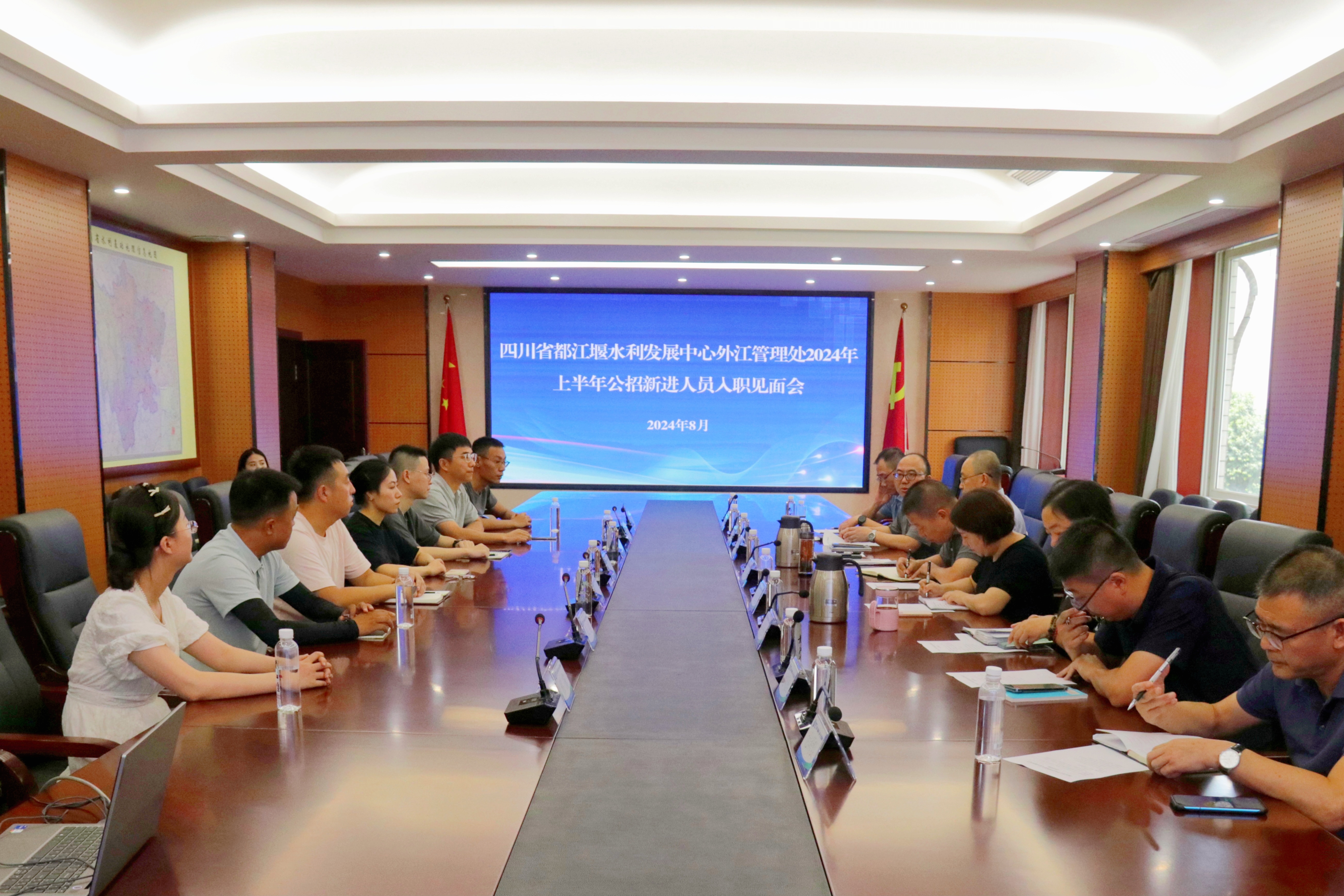 8月26日,都发中心外江管理处召开2024年上半年公招新进人员见面会,党委委员、副处长李伟出席会议并讲话。办公室、财资科、安监科、人事科以及相关水利管理站负责人参加会议。会议由人事科科长郭坚主持。