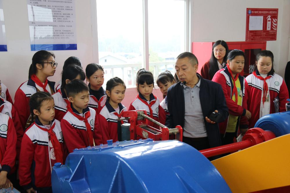 随后,同学们在工作人员的带领下满怀期待地乘车前往了三合堰管理点。在三合堰管理点,工作人员热情接待了这群充满好奇的小客人,向他们详细介绍了三合堰的历史沿革、工程结构以及它在当地农业灌溉、防洪排涝中的重要作用,让同学们了解到这座水利工程在岁月长河中的发展变迁,对水利工程构造有了直观认识。在三合堰闸门控制室,小朋友们亲眼见证了远程监控和控制等信息化技术在现代水利工程中的应用,深刻体会到科技与水利工程的紧密结合对水资源管理和利用的重要性。四川省劳动模范黄端勇的出现更是将气氛推向高潮。黄师傅在闸门启闭机前,用通俗易懂又饱含专业知识的语言为小朋友们讲解了启闭机的构造和运行原理,并亲自进行了实际操作演示。他的讲解既专业又亲切,极大的激发了孩子们对水利技术的浓厚兴趣。黄师傅还勉励孩子们要珍惜学习机会,保持对科学的好奇心,勇于探索未知领域,期望他们将来成为国家的栋梁,为国家发展和民族事业贡献力量。