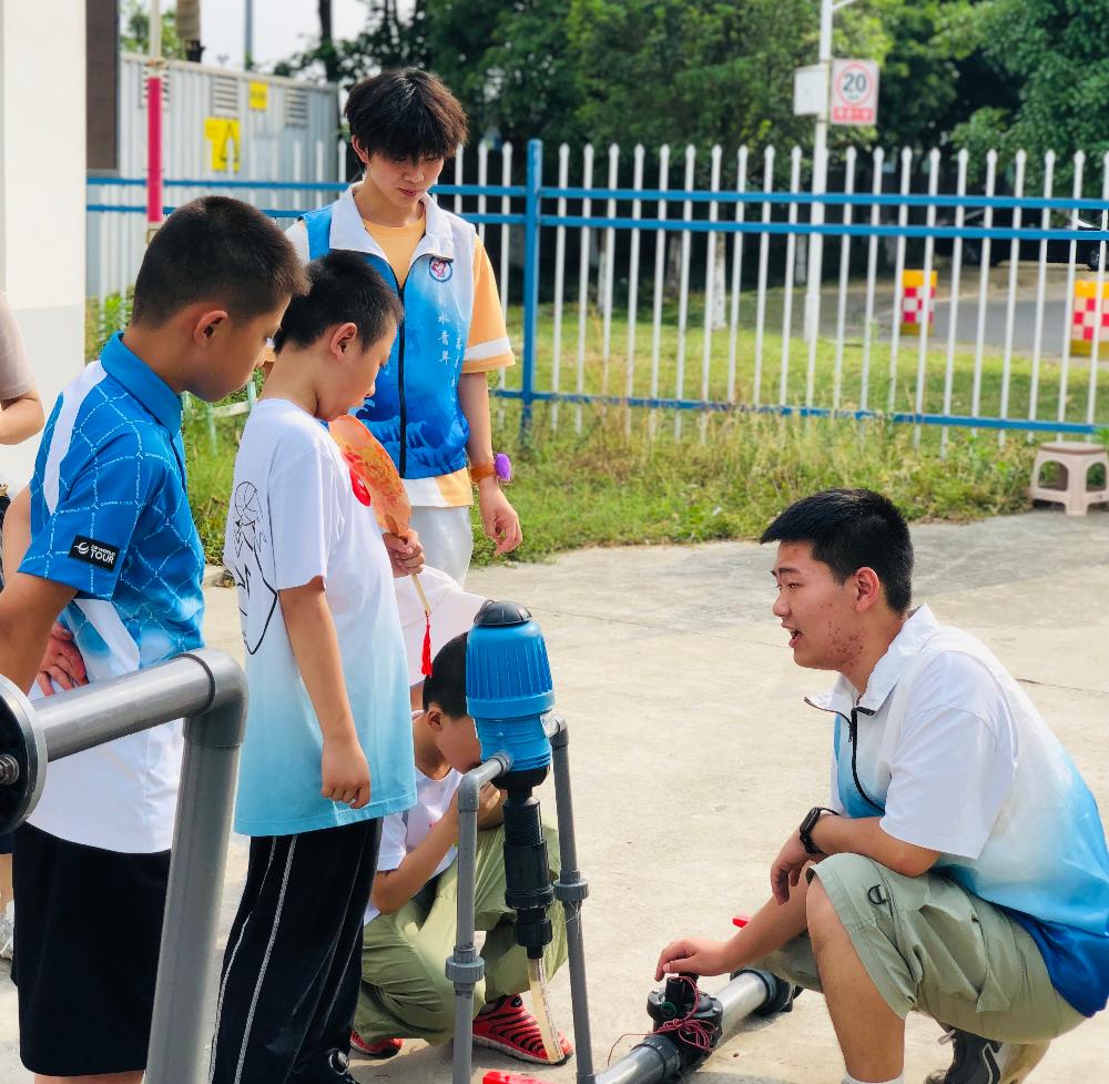 在水利工程学院实训基地,“水粒子探险队”活动精彩上演。孩子们化身“节水探险家”,跟随志愿者的讲解,通过沙盘模型深入了解四川水利工程、水资源分布及节水技术应用,深刻领悟“节水优先”理念的重要性。在节水设施实操环节,孩子们分组合作,在技术人员的耐心指导下,100% 成功完成节水器具的安装,并纷纷承诺回家后要检查家中水管漏水情况,将节水理念转化为实际行动。