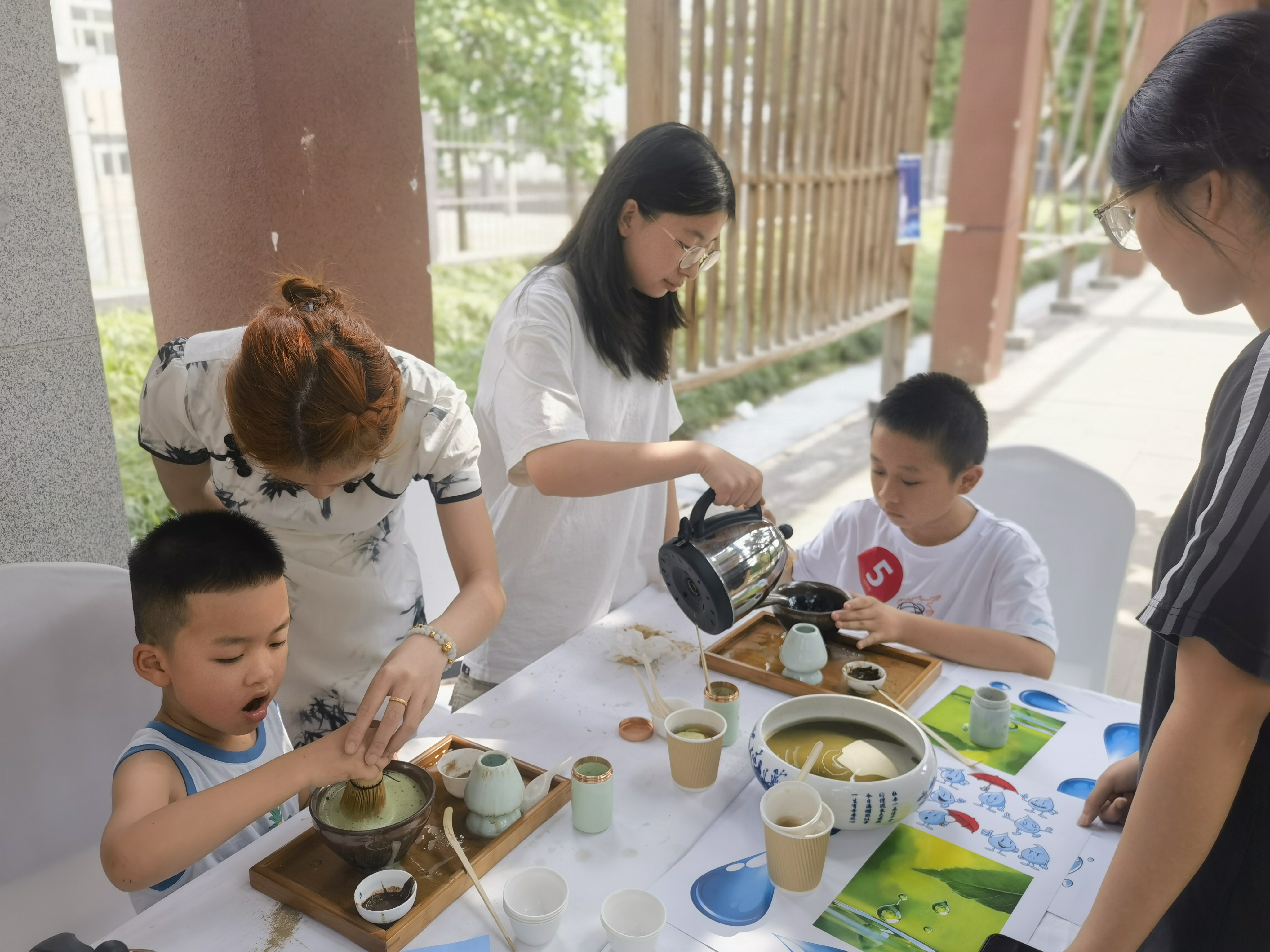 在工匠长廊和职工之家,茶文化与非遗手作体验同步进行,为孩子们带来一场文化盛宴。在点茶技艺体验区,茶艺师现场演示“七汤点茶法”,孩子们亲手研磨茶粉、注水击拂,观察茶汤“沫饽”变化,感受“水为茶之母”的传统智慧;在创意果茶DIY体验区,孩子们根据自己的喜好调配个性化果茶,通过对比不同水质冲泡效果,理解“好水泡好茶” 的科学内涵。而在非遗手作区,孩子们制作漆扇,以水为灵感创作“水纹漆扇”;缝制端午艾草香包,聆听“端午沐兰汤、祈水安”的传统习俗,在动手实践中领略水与艺术、文化的完美融合,传统文化认知进一步深化。