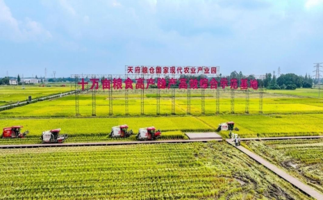 金秋九月,成都市天府粮仓国家现代农业产业园长江上游优质粮油中试熟化基地(崇州市隆兴十万亩片区)里,稻浪翻滚、机声轰鸣,5台联合收割机正开足马力同步作业。2025年秋收首镰正式启动,预计崇州市32万亩高标准农田水稻平均亩产将达555公斤,总产量突破17.7万吨。