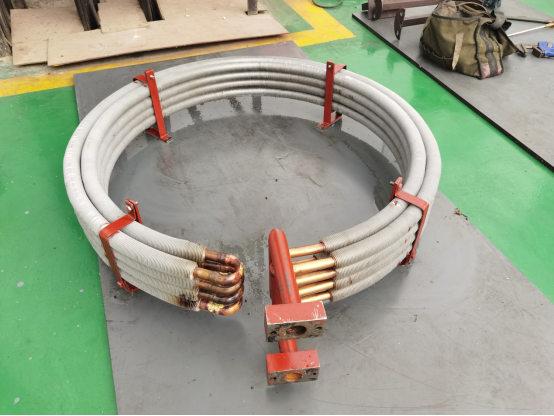 为彻底避免和杜绝冷却器漏水这一影响安全生产的较大缺陷,站领导多次商量并多方询价后,经外江管理处同意,联系具有生产资质的大邑水轮机厂对2号机上导油盆冷却器采用新的生产工艺和方法进行改造生产。2023年11月7日,大邑水轮机厂制造的新型冷却器运到电站,检修人员随即对冷却器进行了试压和评估,并于11月8日将冷却器回装至上导油盆并全面恢复2号机组至生产发电备用状态。