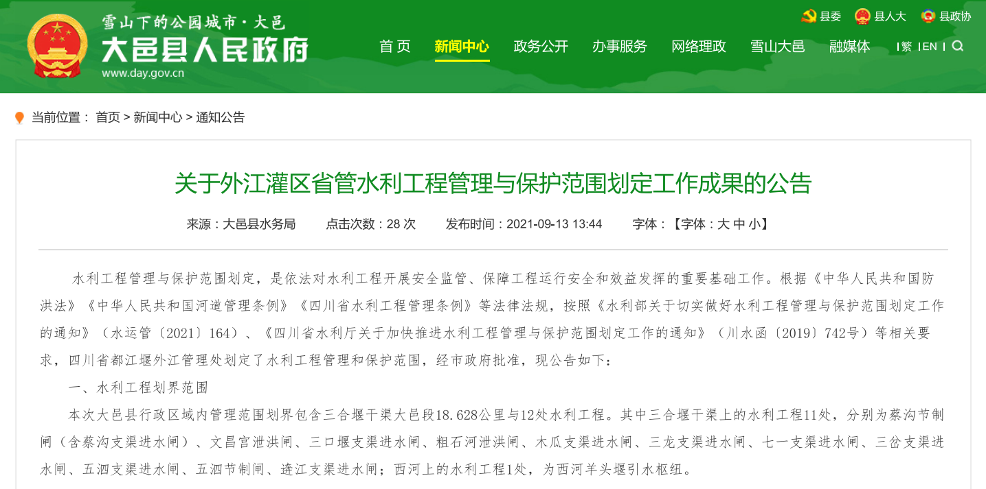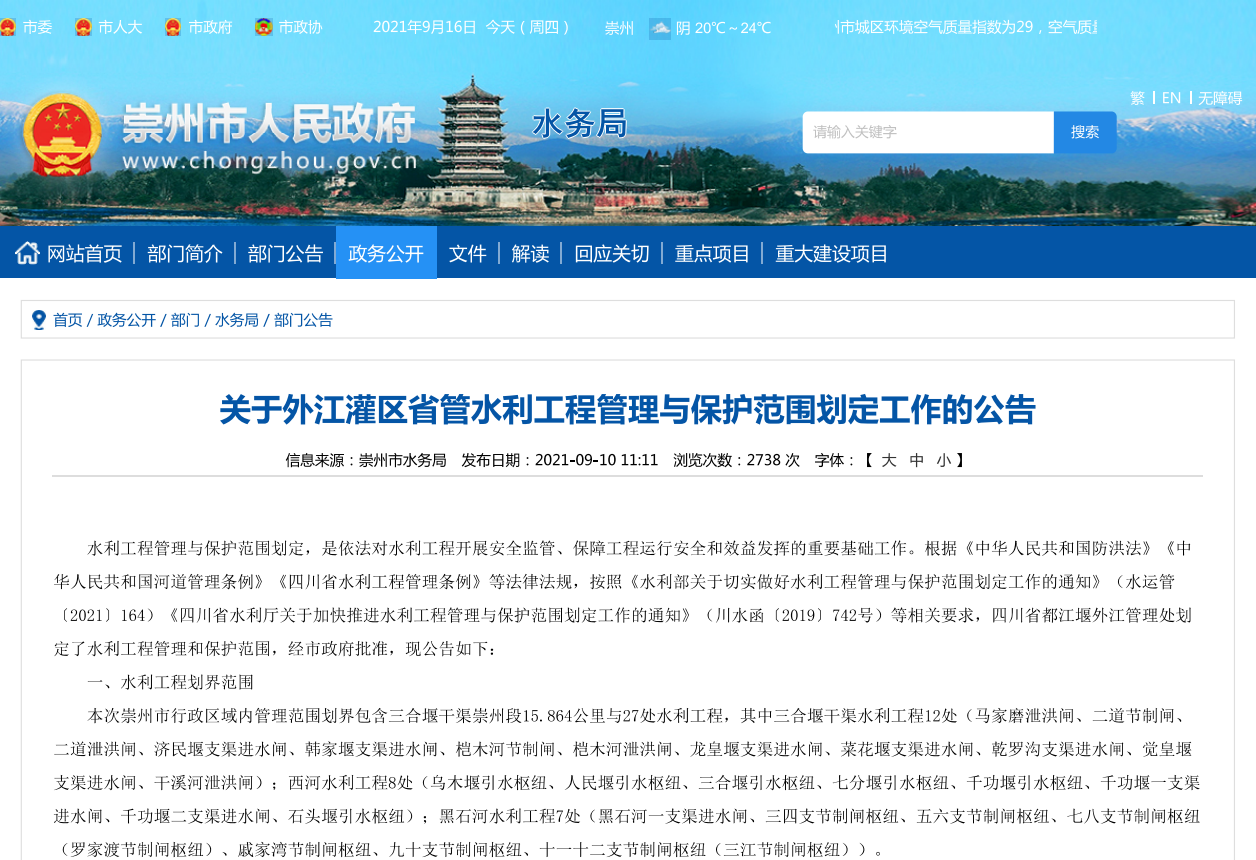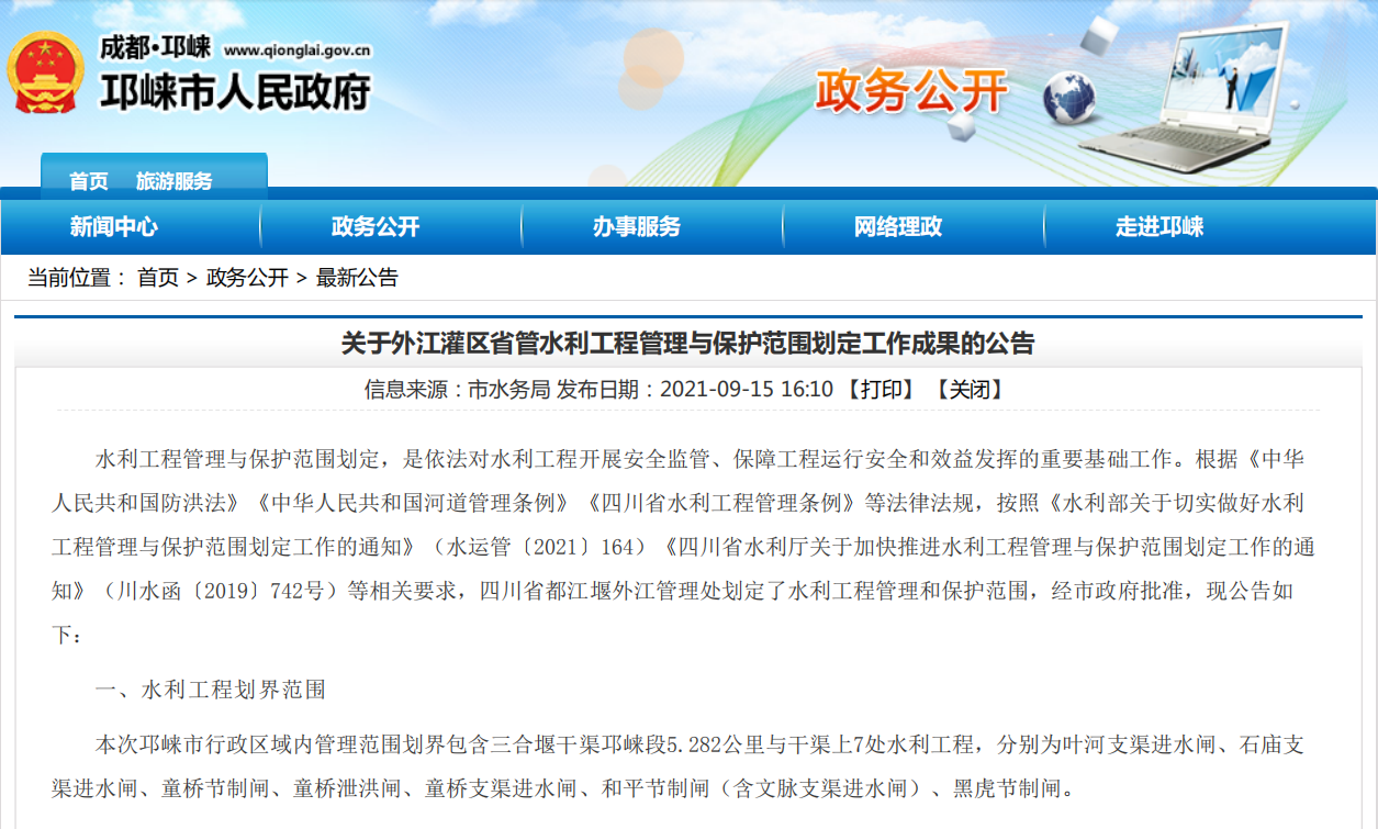 2021年8月,在管理范围线划定成果确定后,我处以正式函件分别向都江堰市、崇州市、大邑县、新津区和邛崃市人民政府递交了划界成果,沟通成果公示事宜。目前崇州市、大邑县、邛崃市人民政府已完成外江灌区省管水利工程管理与保护范围划界成果公示,都江堰市及新津区正在完善公示手续,预计9月21日前全部完成公示。(工程科 姜松)