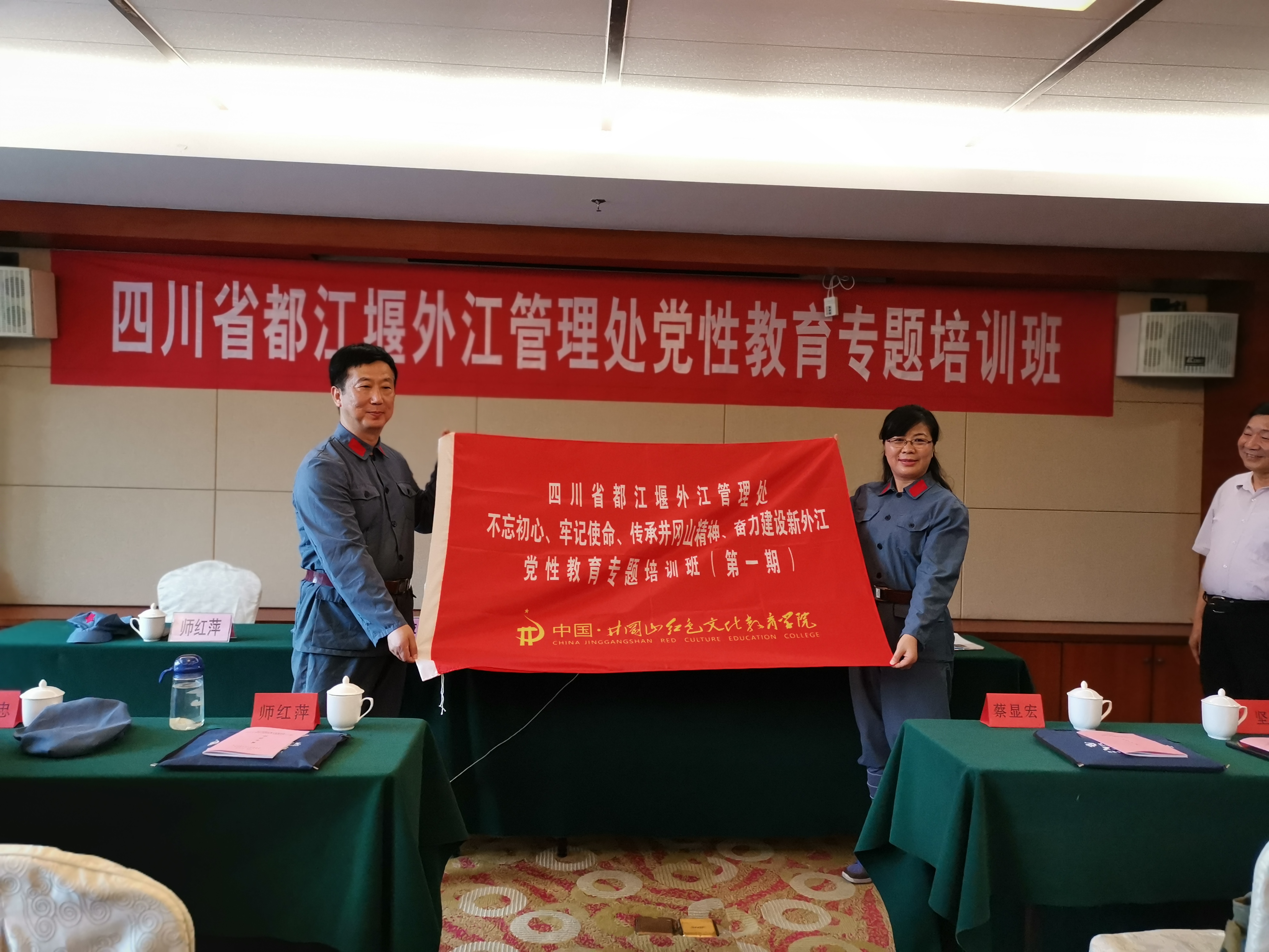 在开班授旗仪式上,处纪委书记蔡显宏、工会主席师红萍代表全体学员接过了班旗,蔡书记在开班讲话中强调,此次的井冈山党性培训机会十分难得,大家一定要提高思想认识,深刻领会本期培训班的重要意义,要把握学习重点,高质量完成学习任务,要严格自我要求,确保学习培训取得实效。