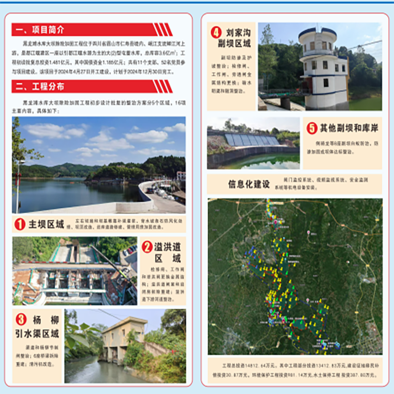 黑龙滩水库大坝除险加固工程包括主坝区域、溢洪道区域、引水渠区域、刘家沟副坝区域、其他副坝和库岸及信息化建设。黑龙滩大坝除险加固工程初设批复总投资1.481亿元,其中国债资金1.185亿元,引水渠区域包含位于水库上游全长 3.6KM的杨柳引水渠、杨柳节制闸及地涵、人行桥等附属工程,投入资金约1000万元。